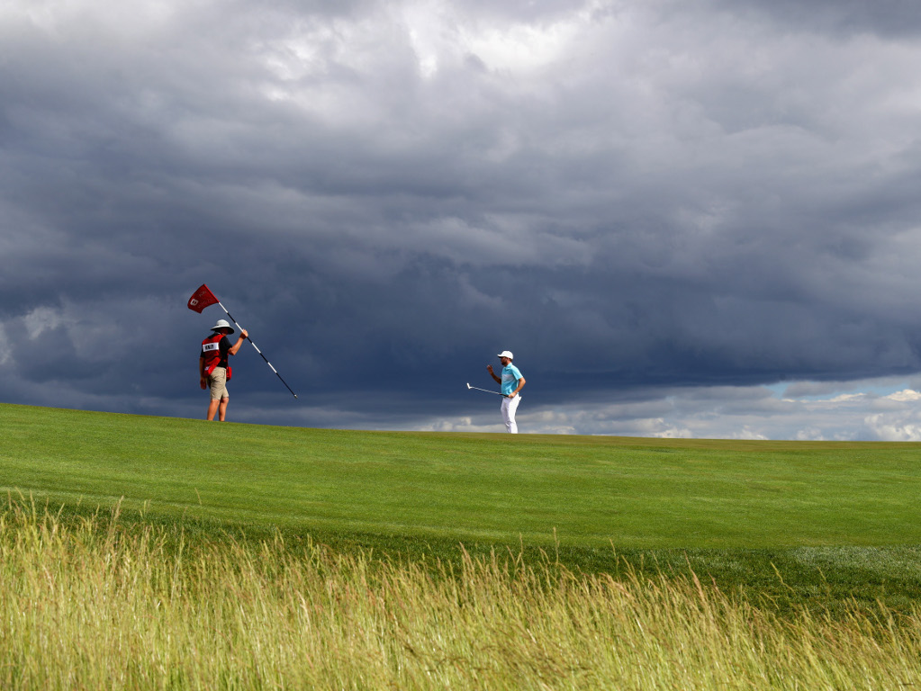 A dramatic shot of Russell Henley during the final round of the US Open at Erin Hills