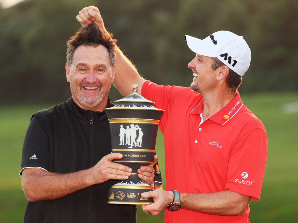 Justin Rose and his caddie Mark Fulcher celebrate victory at the WGC-HSBC Champions